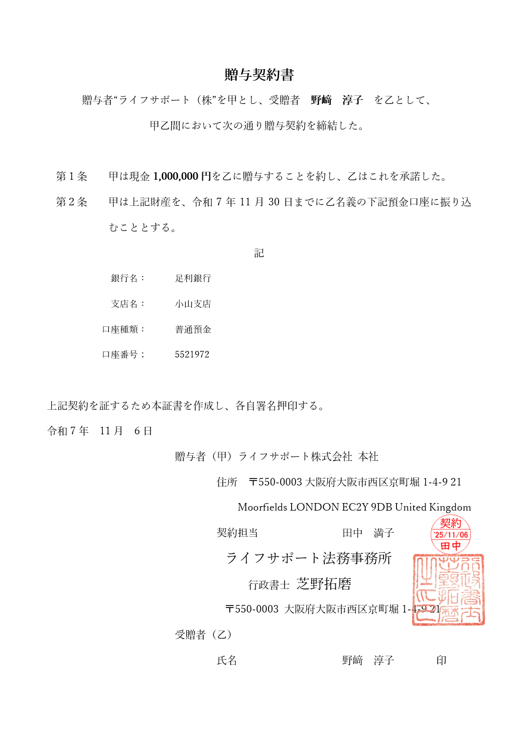 今日、LINEでいただいた情報なのですが、なんだかよく分からない贈与契約書なるものに勝手に私の名前が使われているとのこと👀